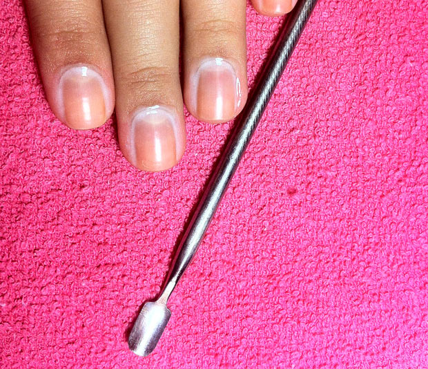 2- Aplique o amolecedor de cutículas e, com o instrumento próprio, empurre-as para o trás e para os lados. Evite removê-las totalmente e corte apenas os excessos maiores.